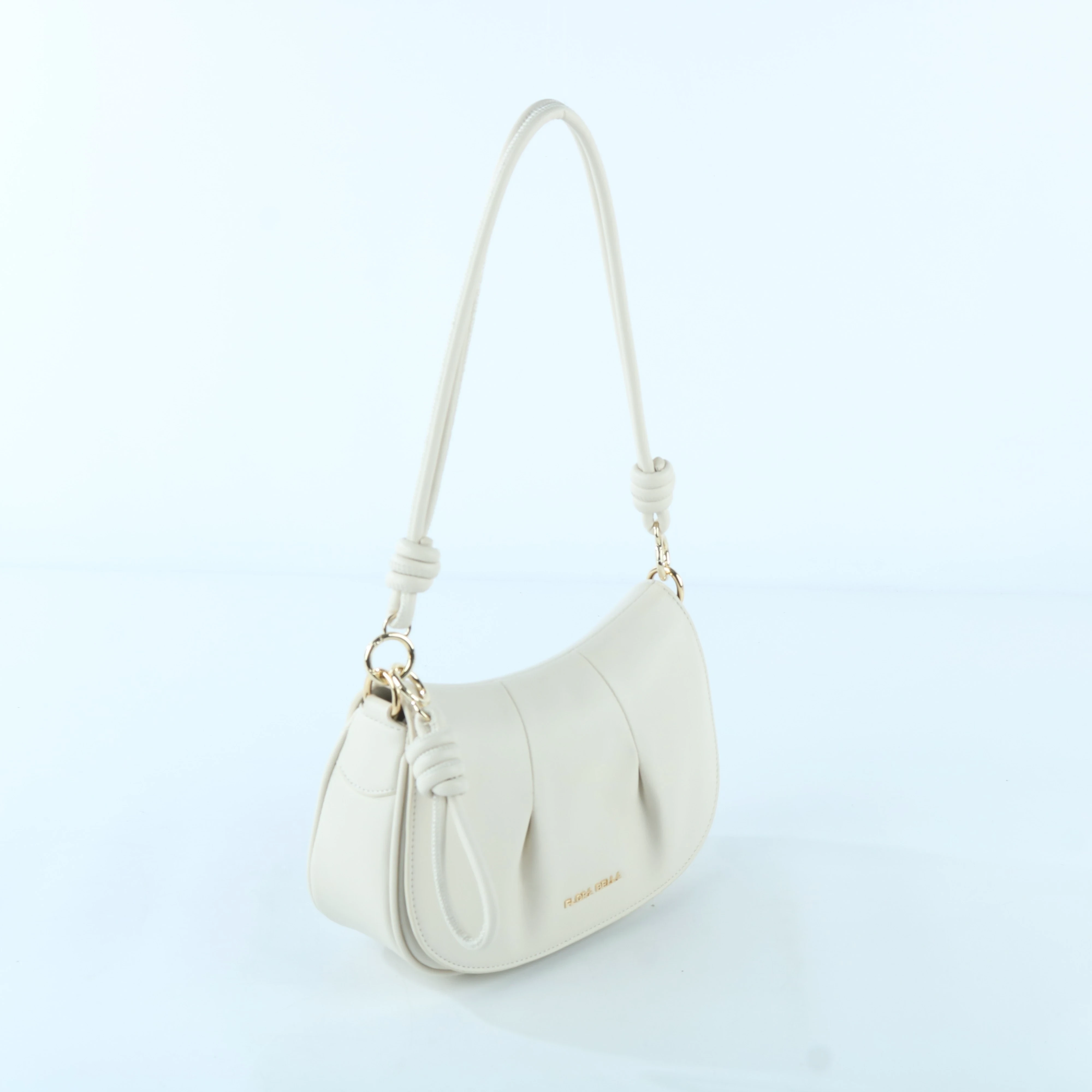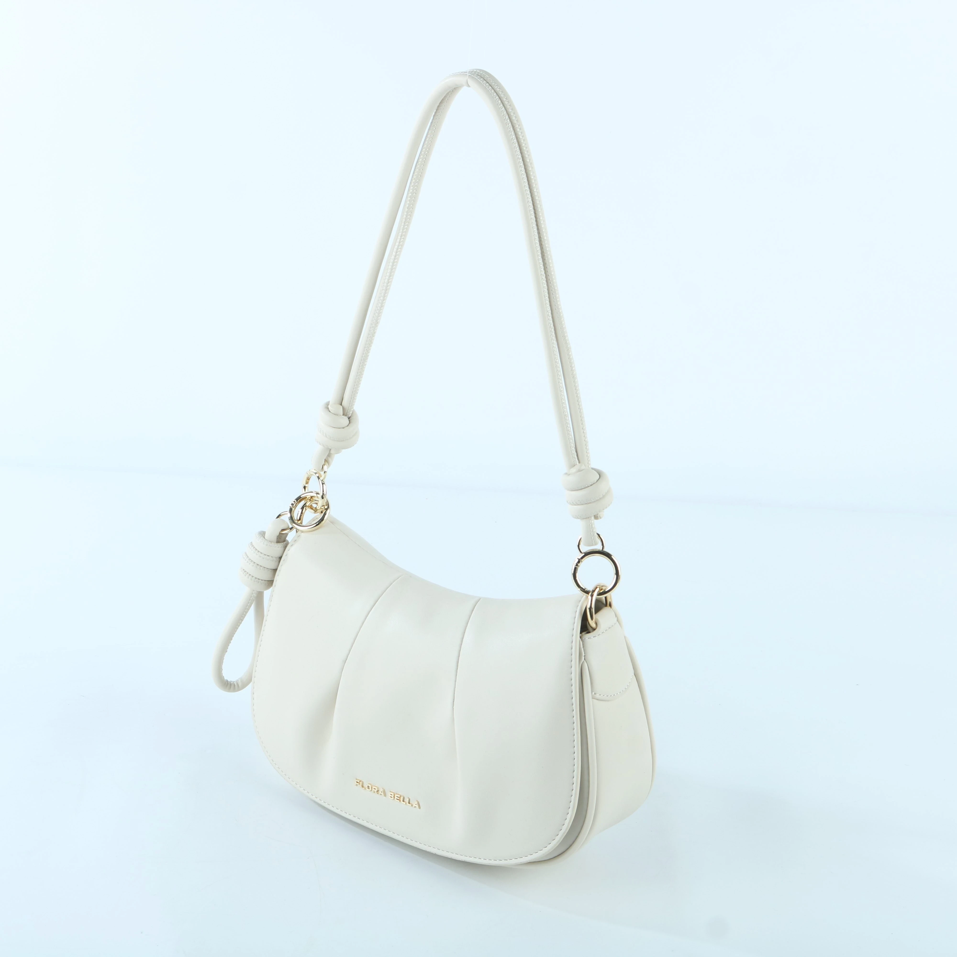 Step into effortless elegance with our FLORA BELLA Cream Pleated Crescent Shoulder Bag—a modern take on the classic hobo silhouette. Crafted from buttery soft vegan leather, this mini bag features delicate front pleats and signature knot details on the strap, blending soft femininity with polished sophistication.